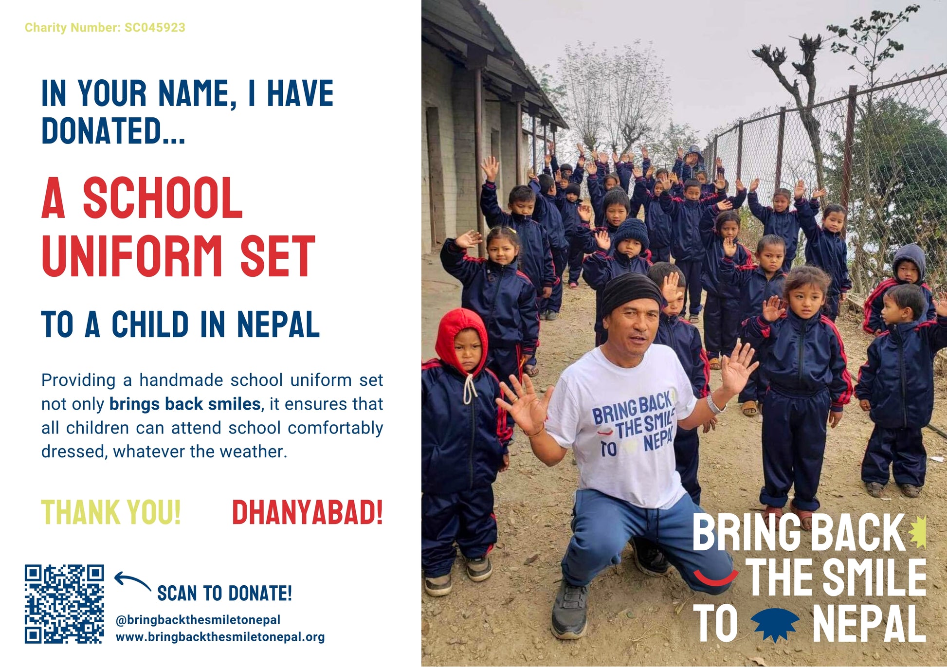 100% of every donation goes directly to Bring Back The Smile To Nepal’s education projects, providing children with the essentials they need to learn and thrive.